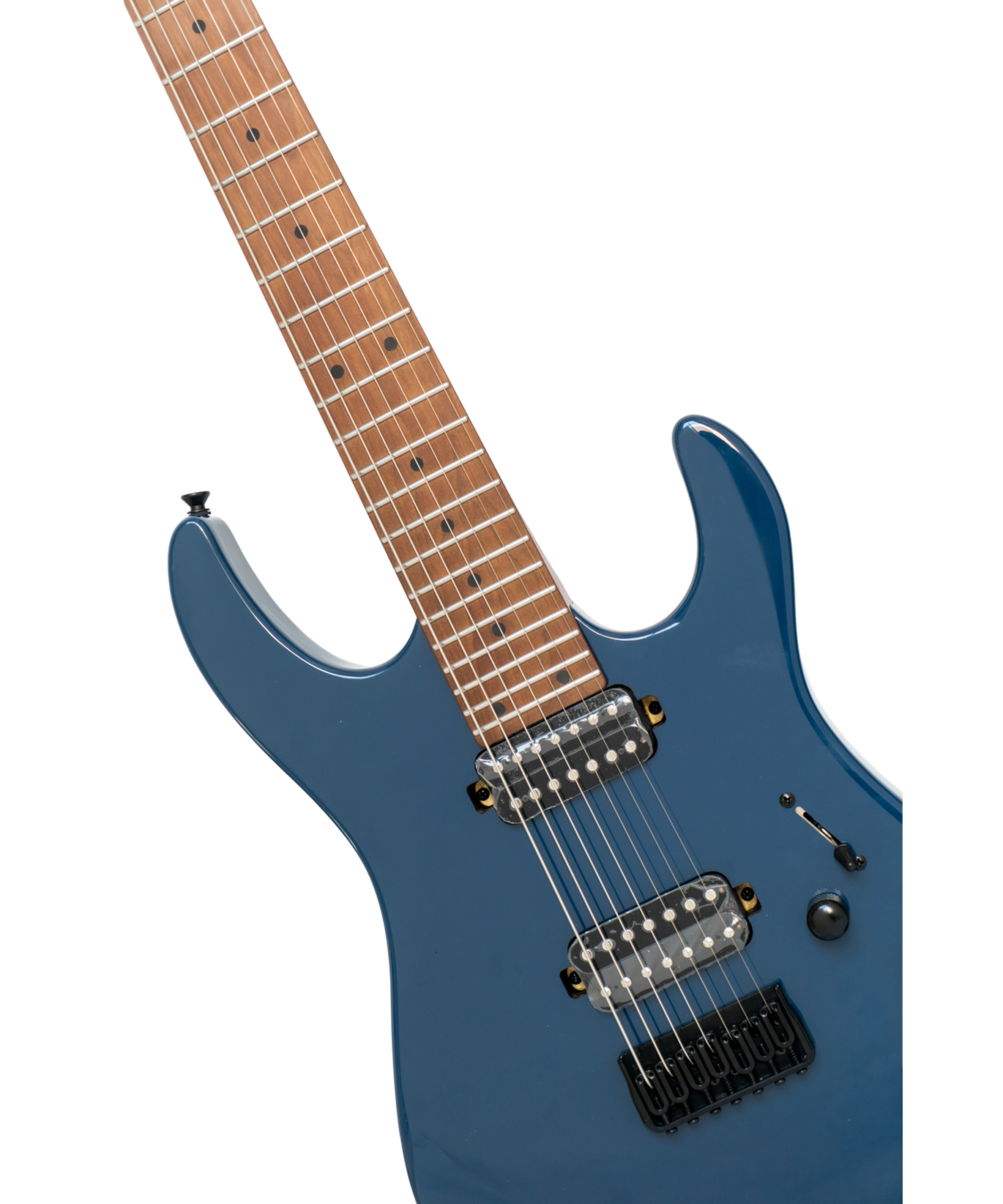 Профессиональная электрическая гитара SEG STR7 BL с корпусом из тополя и грифом из карамелизованного клёна создаёт богатый, насыщенный звук с отличной динамикой, а удобная мензура 25,5″ (648 мм) в сочетании с эргономичным «С»-образным профилем грифа (толщина 20 мм на первом ладу и 22 мм на двенадцатом) обеспечивает максимальный комфорт при игре; 22 скруглённых лада и увеличенный радиус накладки 16″ (406 мм) позволяют легко выполнять сложные технические приёмы и бенды, при этом два хамбакера Alnico Little Giant SSF-1 с трёхпозиционным переключателем, регулятором громкости и ручкой тембра гарантируют плотное, насыщенное звучание с широким диапазоном тональных возможностей, а бридж Hardtail обеспечивает стабильную настройку; чёрная фурнитура придаёт инструменту классический элегантный вид, а увеличенная ширина порожка 48 мм делает эту гитару идеальным выбором для музыкантов с крупной кистью или предпочитающих широкий хват.