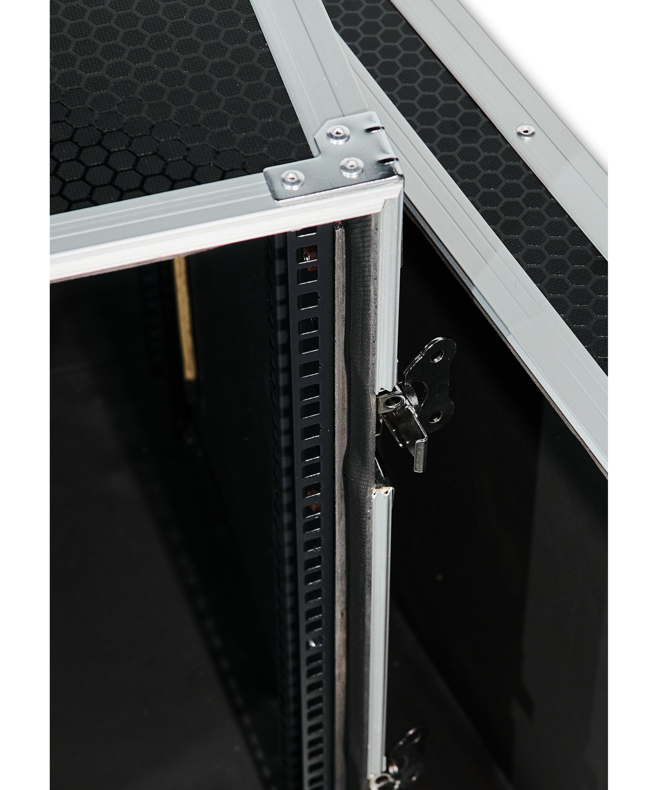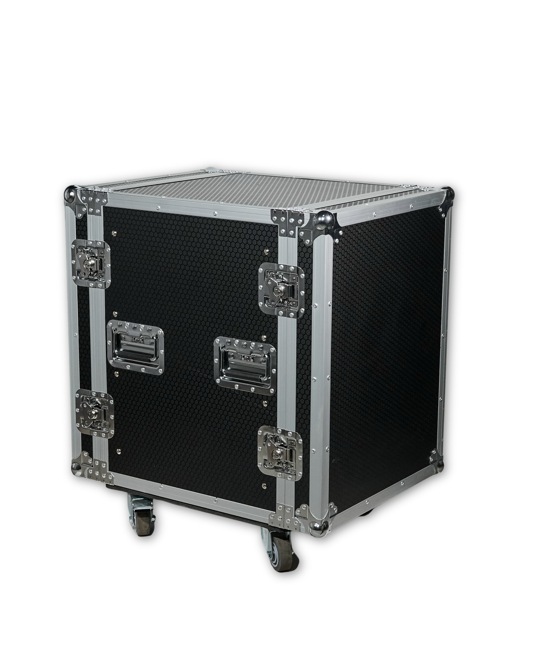 RMW-14U Кейс Рэковый 14U деревянный; ламинированная фанера 9мм; глубина 500мм; две крышки; 8 замков-бабочек; 4 врезные ручки; 4 бесшумных колеса 3″, 2 тормоза, рэковые направляющие с фронтальной и тыльной стороны.
