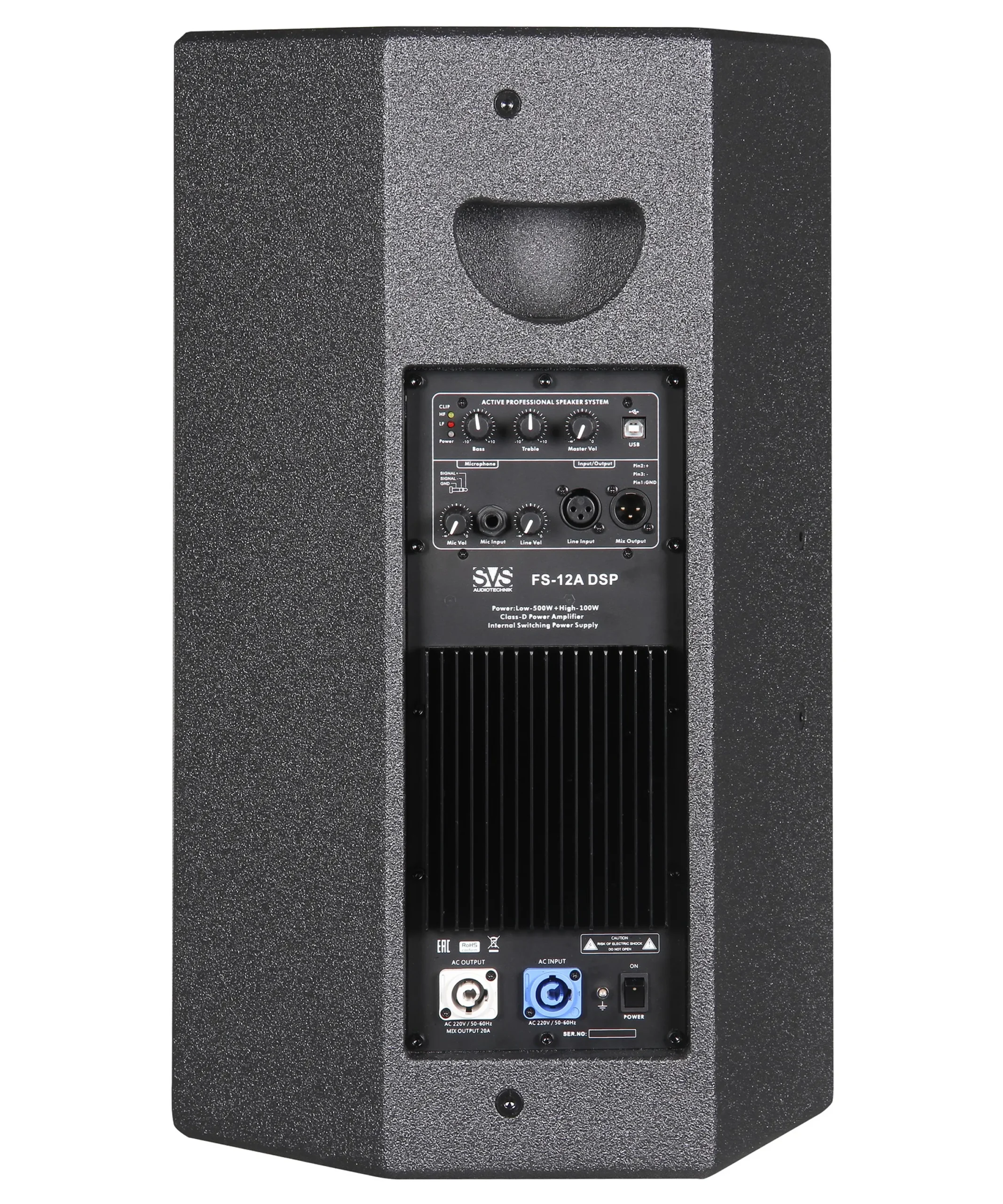 FS -12A DSP – активная двухполосная акустическая система со встроенным DSP процессором. Система оснащена модулем 2-канальногоцифрового усилителя с DSP, драйверами 1×12″(300мм)/3″ звуковая катушка НЧ, 1×1″(25mm)/ 1.7″ звуковая катушка ВЧ. Поворотный рупор 90°×40°. Разъёмы: 1 XLR -IN , 1 XLR-OUT, 1, Mic-IN, 1 AC Connector, 1 AC LINK, USB. Материал корпуса берёзовая фанера, покрытая износостойкой и водостойкой краской. Возможна установка на пол, на стандартную спикерную стойку или подвес на 3 точки.